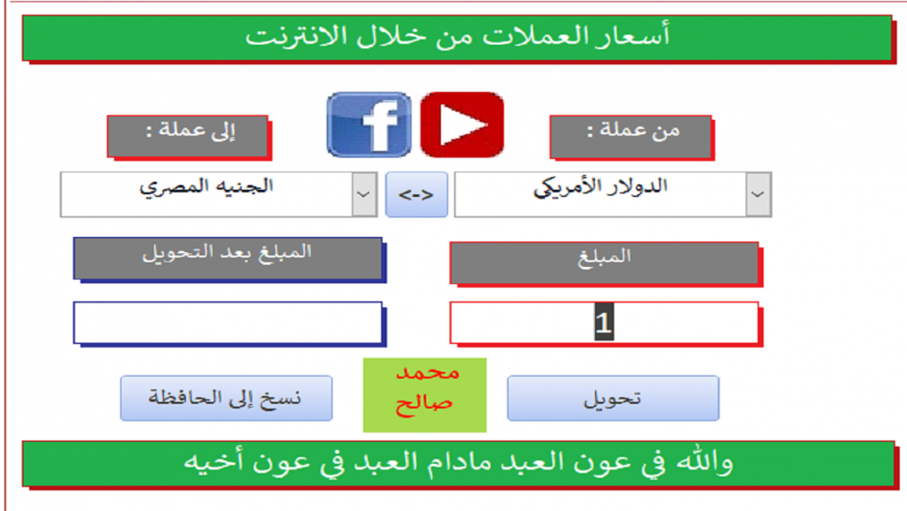 موعدنا اليوم مع شرح طريقة كيف تعرف أسعار العملات اليوم بدون مغادرة برنامجك في VBA اوفيس 2003 أو 2007 أو 2010 أو 2013 أو 2016 أو 2019سواء برنامج اكسس أو اكسل أو وورد أو باوربوينتمع التعرف على أكواد عملات العالم وكذلك اسماء العملات باللغة العربية والانجليزيةالتعرف على نسخ النص الموجود في مربع النص إلى الحافظةوالكثير من المفاجآت اكتشفها بنفسكثالثا لمن يريد تحميل الملف الذي تم استخدامه في الشرحيمكنكم التعليق سواء هنا في المدونة أو في اليوتيوبوسيصلكم رابط الملف بإذن اللهوالآن مع فيديو الشرح**************ولا تنسوا أحبابيالدعاء لغيركم بظهر الغيبحتى يقول لك الملك: آمين ولك مثلها إن شاء اللهوتذكر لو بخل بها غيرك ما وصلت إليكفشارك المعلومة مع جميع أصدقائكفي جميع مواقع التواصل الاجتماعي============القادم أفضل بإذن الله -
