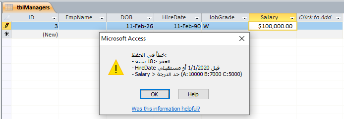 بسيطة بدون خصائص الحقول ولو من الجدول فقط يكون Table Validation Rule كالتالى : (DateDiff("yyyy",[DOB],Date())>=18 Or [DOB] Is Null) And ([HireDate]>=#1/1/2020# And [HireDate]<=Date() Or [HireDate] Is Null) And ([JobGrade] In ("A","B","C") Or [JobGrade] Is Null) And ([JobGrade]="A" And [Salary]<=10000 Or [JobGrade]="B" And [Salary]<=7000 Or [JobGrade]="C" And [Salary]<=5000 Or [Salary] Is Null) يكون Table Validation Text كالتالى : خطأ في الحفظ: - العمر <18 سنة - HireDate قبل 1/1/2020 أو مستقبلي - Salary > حد الدرجة (A:10000 B:7000 C:5000) -