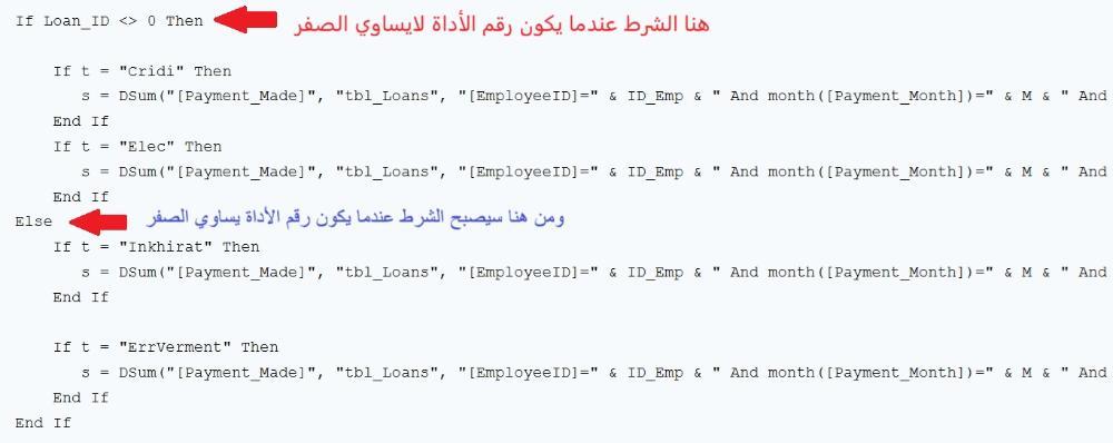 الكود يعمل بشكل صحيح فبحسب الشرط اذا كان رقم الاداه لايساوي صفر (بدون تحديد ما اذا كان اكبر او اصغر من صفر) واسم الحقل هو Cridi او Elec فسيتم إرجاع قيمة التجميع لهذين الحقلين عبارة Else ستعني أنه إذا كان رقم الأداة يساوي صفر واسم الحقل هو Inkhirat او ErrVerment فسيتم إرجاع قيمة التجميع لهذين الحقلين اذا اردت ان يتم النعامل مع جميع الحقول بنفس الشروط قم بحذف عبارة Else وستنحل المشكلة تحياتي