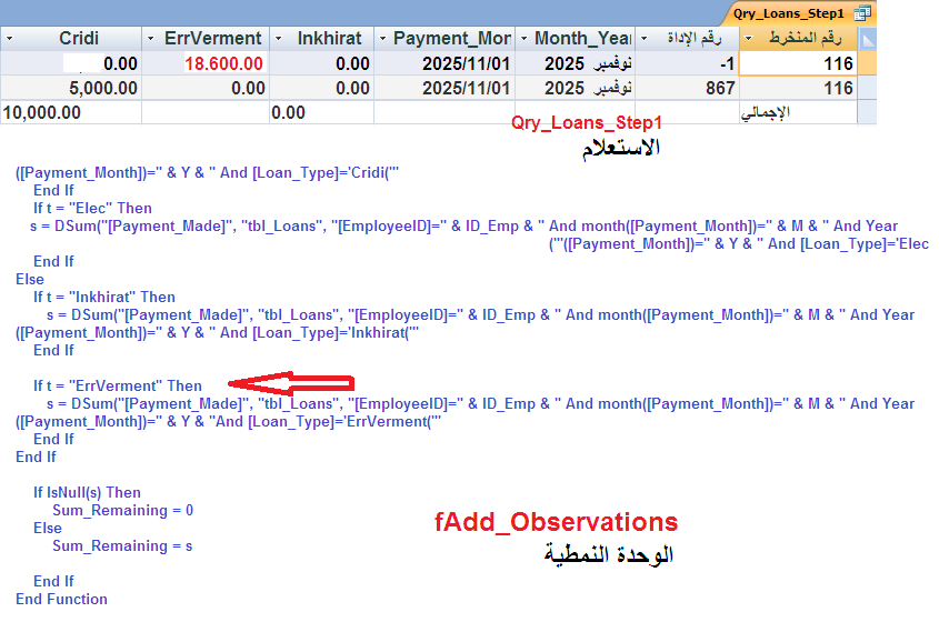 السلام عليكم اساتذتي الكرام ويبقى مد العون والمساعدة قائما من طرف الاساتذة الاجلاء لقوله ﷺ: والله في عون العبد ما كان العبدُ في عون أخيه. عندي مشكلة في الاستعلام Qry_loans_Step1 والمستمد من الوحدة النمطية fAdd_Observations علما ان التاريخ 2025/11/03 وخاصة عند العامل رقم 116يظهر مبلغ ErrVerment في Cridi حيث ان المعني لديه اقتطاع 5000.00 فيCridi ولديه 18.600.00 في ErrVerment مشكلة دفع.rar