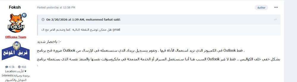 باختصار شديد :- ضرورة فتح برنامج Outlook في الكمبيوتر الذي تريد استعمال الأداة فيها . وتقوم بتسجيل بريدك الذي ستستعمله في الإرسال من Outlook فقط . السبب هنا أننا سنستعمل السيرفر أو الخدمة المدمجة في مايكروسوفت نفسها والمنفذ نفسه الذي يستعمله برنامج Outlook بشكل خفي خلف الكواليس .. فقط لا غير . -