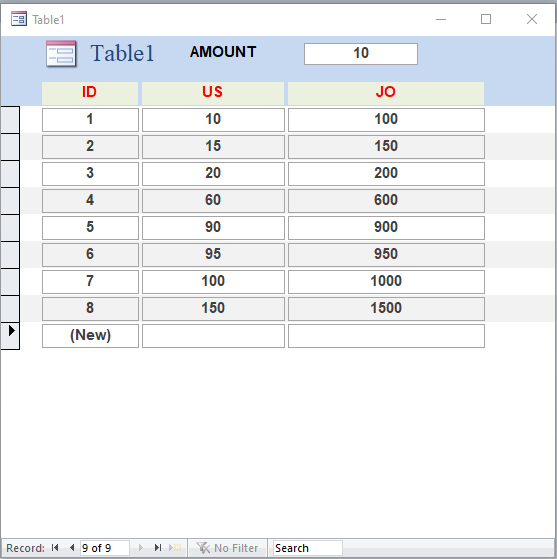 السلام عليكم ورحمة الله وبركاته طلب مني صديق لي شيء بسيط لكنه اعجزني اطلب منكم الفزعه والمساعدة عندي نموذج مستمر يتم ادخال المبلغ بالدولار وفوق يوجد تكست بوكس غير منضم اريد عند وضع رقم معين في هذا البوكس الغير منضم واكبس انتر يجري عملية حسابية لكافة الحقول بحيث يضرب العدد بالدولار بالعدد اللي ادخلته بالتكست بوكس ويكتب النتيجة في حقل الدينار الاردني مثل هذه الصورة ملاحظة // الاعداد تحت حقل JO المفروض المعادلة تكتبهم مرفق قاعدة بيانات للتطبيق عليها اوفسنا حساب.accdb