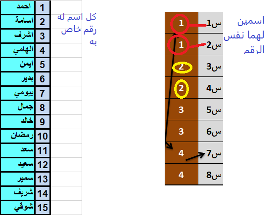 2. الملف الذي ارفقته فكرته واضحة وهو ليس بنفس فكرة ملفك تحويل اللجان الى اسماء لسبب بسيط ملقك الاخير تحويل الارقام الى اسماء كل اسم له رقم فريد بمعنى لا يحمله اسم اخر ملفك الاول تحويل اللجان الى اسماء الرقم يتكرر لاكثر من اسم تحويل المعادلات الى كود والكود لاستاذنا الفاضل عبدالله باقشير جعله الله في ميزان حسناته تحويل الارقام الى اسماء.xlsb