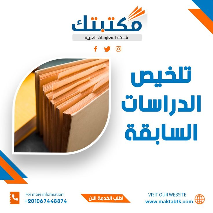 10. تُقدّم شركة مكتبتك – شبكة المعلومات العربية خدمات أكاديمية متكاملة لدعم الباحثين في إعداد الدراسات السابقة باحترافية عالية؛ حيث نوفر نموذجًا للدراسات السابقة في البحث العلمي مصاغًا وفق المعايير الأكاديمية المعتمدة، كما نساعدك على فهم كيفية كتابة الدراسات السابقة في رسالة الماجستير بأسلوب منهجي يبرز الفجوة البحثية ويعزز قوة الدراسة، ونوفر أيضًا نموذج تلخيص الدراسات السابقة بطريقة واضحة ومركزة تسهّل عرض النتائج وربطها بموضوع البحث.