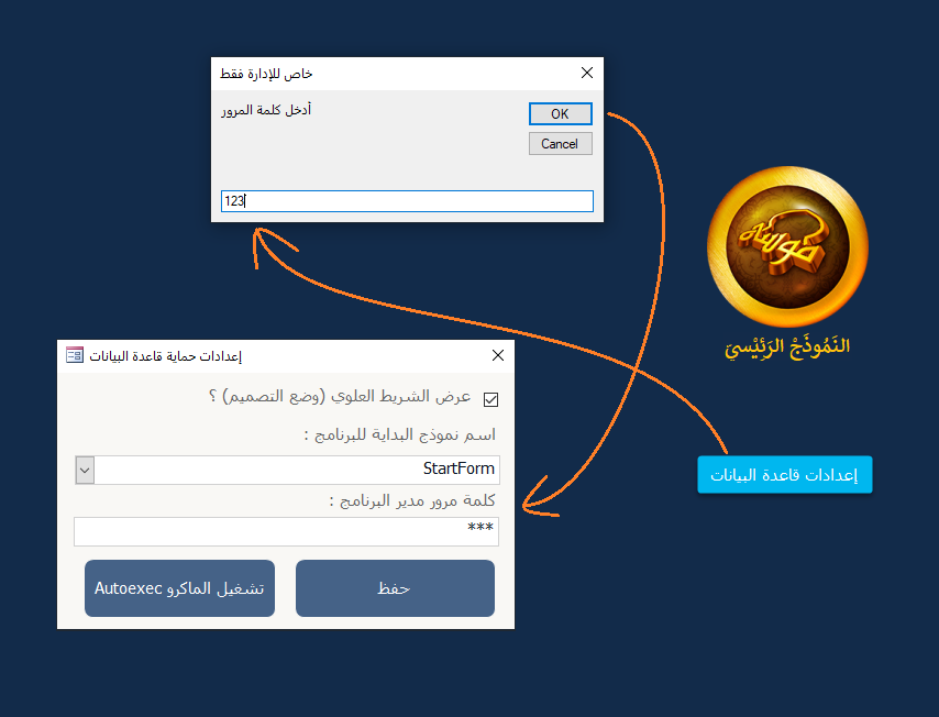 وعليكم السلام ورحمة الله وبركاته 🙂 جرب طريقتي في حماية قاعدة البيانات .. أنقل جميع مكونات القاعدة لبرنامجك وشغله .. 🙂 وهذي طريقة طبط الإعدادات .. لفتح اللبرنامج في وضع التصميم : كلمة المرور لفتح الإعدادات : 123 ( قم بتغييرها لاحقا ) الحماية تشمل : 1- إخفاء الجداول وجميع مكونات البرنامج . 2- منع الفتح بزر الشفت Shift . 2- منع إضهار لوحة التحكم عند الضغط على F11 . وهذا يعتبر الحد الأدنى والأشهر في حماية قاعدة البيانات .. ويمكنك التعمق للوسائل الأكثر احترافية مثل حماية صفحة الأكواد بكلمة مرور وحفظ الملف بصيغة accde وحماية الملف بكلمة مرور وغيرها .. دمتم سالمين 🙂 Database Security Template.accdb - Today