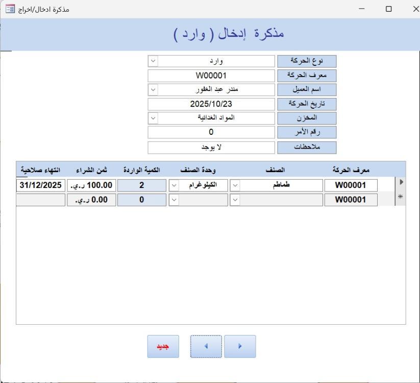 قمت بإضافة البيانات واعدت فتح التطبيق وظهر بشكل طبيعي كما بالصورة لم يكن هناك اي كميات في النسخة التي قمت بتنزيلها من موضوع الأخ @ابوخليل تم معالجة هذا الأمر في المرفق تحياتي stock6 .rar -