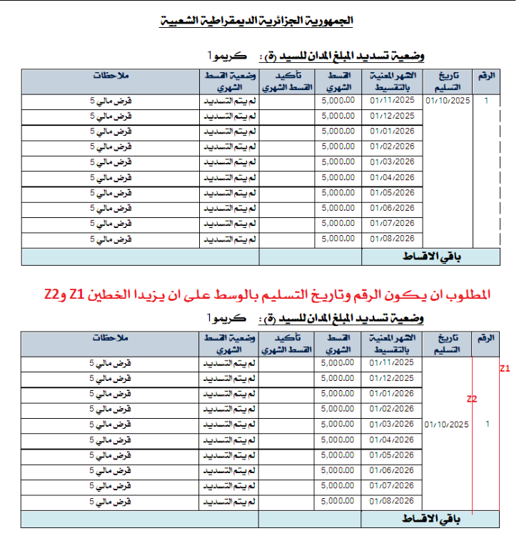 السلام عليكم اساتذتي الكرام المطلوب توسيط الرقم وتاريخ التسليم في التقرير Tbl_Loans مع تسطير زيادة الخطين Z1 وZ2 على طول مسافة تفصيل الجدول بكود Z1.rar