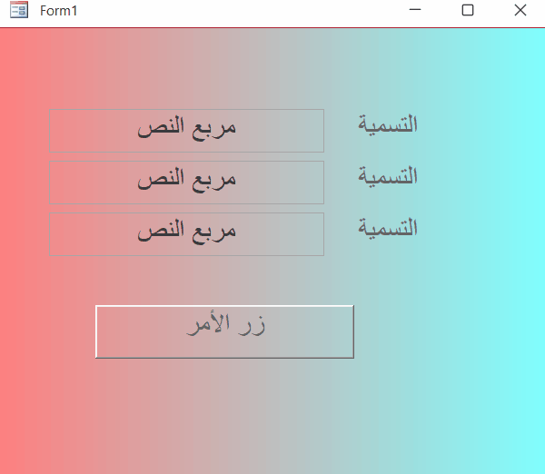 2. بعد التفكير في سؤالك اخي @Moosak أعتقد أنه بالإمكان الحصول على نفس النتيجة بطريقة غير مباشرة فإذا ماجعلنا خلفية مربعات التسمية ومربعات النص شفافة وبسطرين برمجيين لزر الأمر يمكننا الحصول على نفس النتيجة كما بالصورة فهل هذا هو ماكنت تقصده في سؤالك ؟