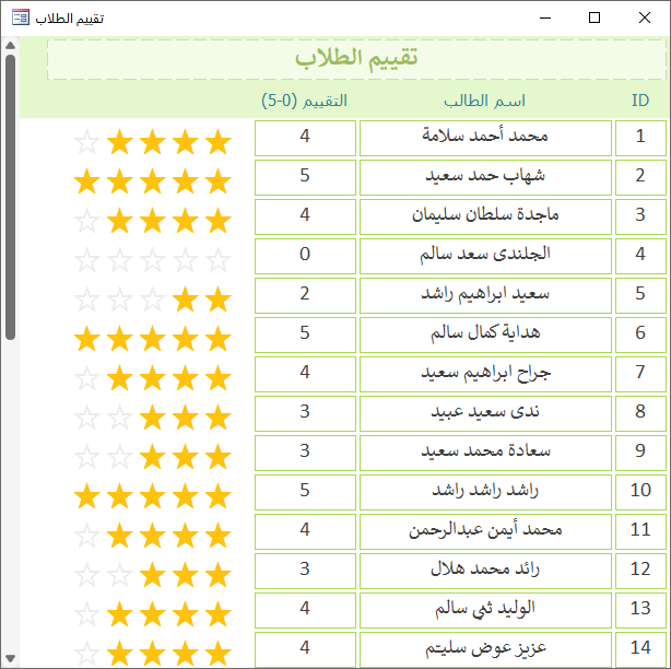 استخدم هذا <><><><><><><> Private Sub btnStar1_Click() If Me.MyRating = 1 Then Me.MyRating = 0 Else Me.MyRating = 1 End If Me.Dirty = False End Sub Private Sub btnStar2_Click() If Me.MyRating = 2 Then Me.MyRating = 1 Else Me.MyRating = 2 End If Me.Dirty = False End Sub Private Sub btnStar3_Click() If Me.MyRating = 3 Then Me.MyRating = 2 Else Me.MyRating = 3 End If Me.Dirty = False End Sub Private Sub btnStar4_Click() If Me.MyRating = 4 Then Me.MyRating = 3 Else Me.MyRating = 4 End If Me.Dirty = False End Sub Private Sub btnStar5_Click() If Me.MyRating = 5 Then Me.MyRating = 4 Else Me.MyRating = 5 End If Me.Dirty = False End Sub