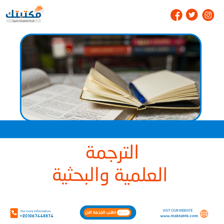 تُقدّم شركة مكتبتك – شبكة المعلومات العربية خدمة الترجمة العلمية باحترافية عالية تلبي متطلبات الباحثين وطلبة الدراسات العليا، نُساعد في ترجمة بحث علمي بالإنجليزي مع الالتزام بالدقة اللغوية والمصطلحات الأكاديمية المعتمدة، والحفاظ على المنهجية العلمية للنص الأصلي، كما نوفر دعمًا متكاملًا لإعداد وصياغة أبحاث بالإنجليزي بأسلوب أكاديمي رصين يتوافق مع معايير الجامعات والمجلات العلمية المحكمة، بما يُسهم في رفع جودة البحث وتعزيز فرص قبوله ونشره وتميّزه الأكاديمي.