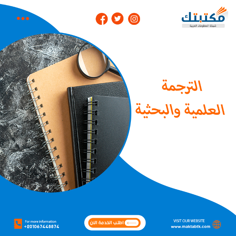 تُقدّم شركة مكتبتك – شبكة المعلومات العربية خدمة الترجمة البحثية والعلمية المتخصصة وفق معايير أكاديمية دقيقة تضمن سلامة المعنى ودقة المصطلحات التخصصية، نُوفّر ترجمة علمية من العربية إلى الإنجليزية بأسلوب احترافي يحافظ على المنهجية العلمية وصياغة البحث الأكاديمية، كما نُساعد الباحثين في ترجمة بحوث باللغة الإنجليزية مع مراجعة لغوية وعلمية شاملة، بما يُسهم في رفع جودة العمل البحثي وتعزيز فرص قبوله ونشره في الجامعات والمجلات العلمية الدولية.