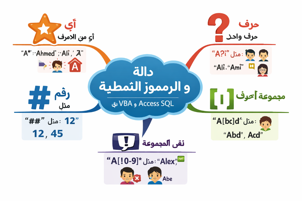 معلومة جديدة علي .. هل لك أن توضحها لي اكثر أستاذي الفاضل 🎯 ما معنى "النمط"؟ النمط هو شكل عام (Template) تضعه لتصف نوع النص الذي تبحث عنه. بدل ما تقول "أريد كلمة اسمها بالضبط Ali"، تقول: "أريد أي كلمة تبدأ بـ A وتنتهي بـ i". هنا تدخل الرموز الخاصة (Wildcards) لتسمح بالمرونة. 🛠️ الرموز (Wildcards) بالتفصيل *: أي عدد من الأحرف (حتى لو صفر). "A*" يطابق "Ali", "Ahmed", "A". ?: حرف واحد فقط. "A?i" يطابق "Ali" و"Ami" لكن لا يطابق "Azii". #: رقم واحد فقط (0–9). "##" يطابق "12" أو "45". [ ]: مجموعة أحرف مسموحة. "A[bc]d" يطابق "Abd" أو "Acd". [! ]: نفي المجموعة. "A[!0-9]*" يطابق أي نص يبدأ بـ A ولا يليه رقم. * مثال عملي في Access SQL SELECT * FROM Employees WHERE Name LIKE "M*"; هذا يسترجع كل الموظفين الذين تبدأ أسماؤهم بحرف M. * مثال عملي في VBA Dim txt As String txt = "Mahdi" If txt Like "M*" Then MsgBox "النص يبدأ بحرف M" End If If txt Like "*di" Then MsgBox "النص ينتهي بـ di" End If If txt Like "?????" Then MsgBox "النص مكون من 5 أحرف بالضبط" End If * الفكرة الجوهرية أنت لا تبحث عن تطابق كامل، بل عن تطابق مع شكل عام. النمط هو "قالب" يصف ما تريده، والـ Wildcards هي الأدوات التي تجعل القالب مرنًا واليك خريطة ذهنية