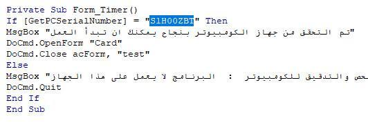 2. السلام عليكم /// طيب الله اوقاتكم لدي في المرفق نموذج دخول المستخدمين باسم (Login) ونموذج لفحص سريال الجهاز باسم (test) ومن ثم بعد التحقق من صحة سريال البورد تعمل القاعدة المطلوب دمج النموذجين ب(Login) + (test) بنموذج واحد فقط ... ملاجظة : قد لا تعمل القاعدة لديك يمكنك فتح نموذج (Shift) يكشف لك رقم الماذر بورد لجهازك و نسخ الرقم والصاقه في (عند عداد الوقت) لنموذج (test) لتعمل القاعدة على جهازك بسهولة حسب الصورة الموضحة كلمة المرود / محمد / 123 حاولت بدمج الاكواد وترتيبها للنموذجين اعلاه ولم افلح .... مع فائق الشكر والتقدير Database.accdb