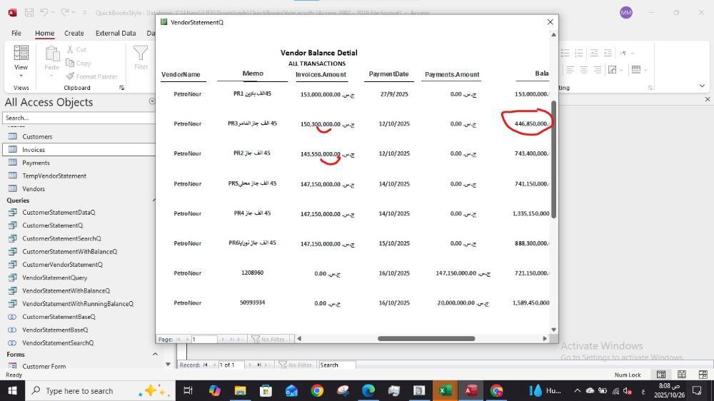 @منتصر الانسي مفترض الرصيد التراكمي يزيد لما تكون في فاتورة و ينقص عند وجود دفع في حالة بتحصل لمن تكون في عدة رحل في نفس اليوم وبيحصل انه اي رحل في نفس اليوم بتتجمع مع بعض والصح اي رحلة تكون في صف مثلا عندك المورد رقم 4 Pertonour عندة عدد 2 رحل يوم 12/10 حط كل وحدة في صف 150300000 و 143550000 عمل ايه في الاول جمعهم الاتنين مع +153000000=446850000 الصح الطبيعي انه 153000000 + 150300000=303300000 +143550000=446850000 +147150000=594000000 وهكذا اذا عندي دفع يخصم كل عملية تكون لوحدها