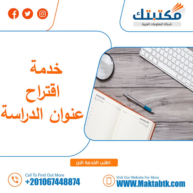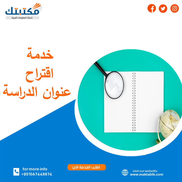 تُقدّم شركة مكتبتك – شبكة المعلومات العربية خدمة أكاديمية متخصصة في اقتراح عناوين رسائل ماجستير ودكتوراه وفق معايير البحث العلمي ومتطلبات الجامعات، نُساعد الباحثين على صياغة عنوان رسالة ماجستير يعكس مشكلة بحث واضحة وقابلة للدراسة، مع توفير عناوين تصلح رسائل ماجستير تتميز بالأصالة والحداثة وتناسب مختلف التخصصات، بما يُمهّد لمسار بحثي قوي ويُعزّز فرص القبول والتميّز الأكاديمي.