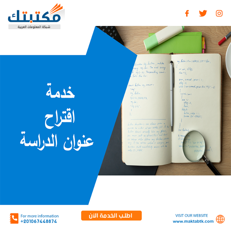 تُقدّم شركة مكتبتك – شبكة المعلومات العربية خدمة أكاديمية متخصصة في اقتراح عناوين للبحث العلمي مصاغة وفق المعايير المنهجية المعتمدة في الجامعات، نُوفّر للباحثين قائمة عناوين مترجمة بدقة علمية ولغوية عالية، بما يضمن سلامة المصطلحات ودقة المعنى الأكاديمي، كما نُساعد في تحديد وصياغة عنوان الدراسة في البحث العلمي بصورة واضحة تعكس مشكلة البحث وأهدافه، وتُعزّز فرص القبول والتميّز الأكاديمي منذ البداية.