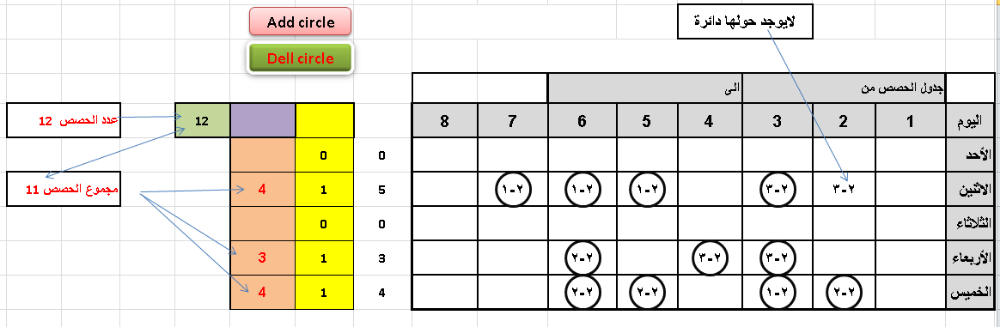 والله العظيم انا محرج منك استاذي ..... ولكن انظر للصورة مجموع الحصص الزيادة 12 وبعد تعديل حضرتك المجموع 11 وبالتالي ناقص حصة وبالتالي لم يتم عمل دائرة على الحصة ٣-٢ -
