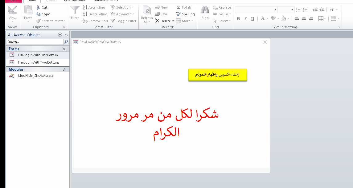 سيتم اغلاق النماذج كاملة ، وبالتالي من الطبيعي الحماية لن تعمل إلا عند تشغيل نموذج البداية الذي يستدعيها . نعم ، ولا يمكنك الدخول إلى محرر الأكواد بكل الطرق . حتى لو اغلقت النموذج واخترت وضع التصميم والحدث لأي عنصر ، كما في الصورة في رأس الموضوع ..