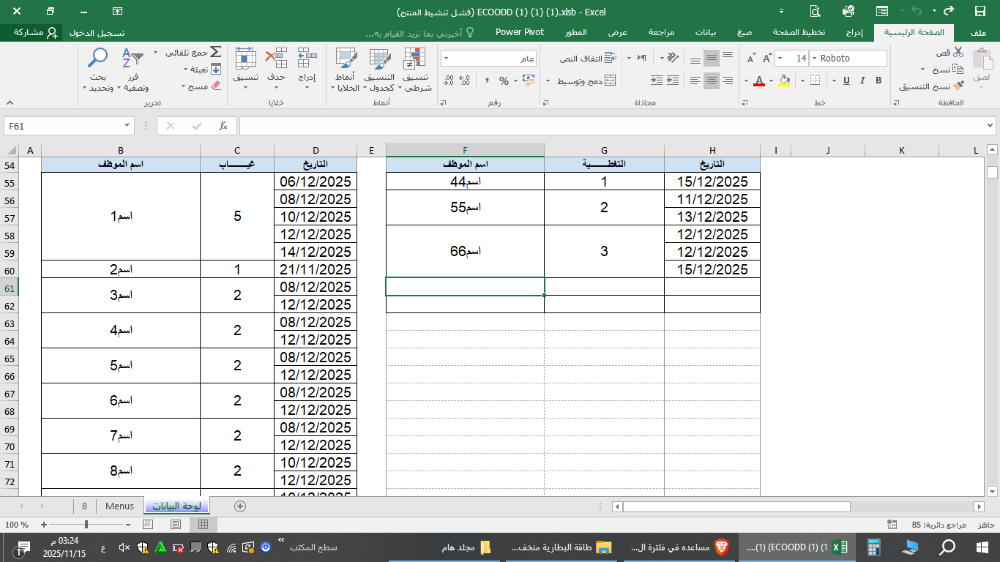 يسعدك ربي في الدارين تمام الله يحفظك احتاج اضافة التواريخ فقط كما في الجدول بمعنى من يوم 1 حتى 30 اذا غاب 3 ايام يتم ادراج 3 ايام مع التاريخ وكذلك التغطيات وغيرها ECOO (1) (1).xlsb -