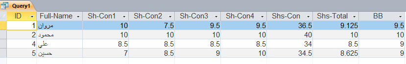 مساء الخير لو سمحت انا عندى مشكلة في العلامه العشرية فى الاكسيس بمعنى انا عندى الطفل له 4 امتحانات هجمعهم واقسم على 4 يعنى مثلا مروان درجاته 10 و 7.5 و 9.5 و 9.5 كدا المجموع 36.5 المفروض اقسم على 4 هيطلع 9.125 انا مش عاوز كدا عاوز يعمل تقريب يعنى الرقم دا يبقي 9.5 وكمان لو الطفل درجته 9.5 تبقي زى ما هي ولو درجته 9.6 تتقرب الى 10 Database1.accdb