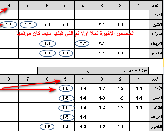 توزيع عدد الحصص الزيادة للمعلم على مدار الاسبوع