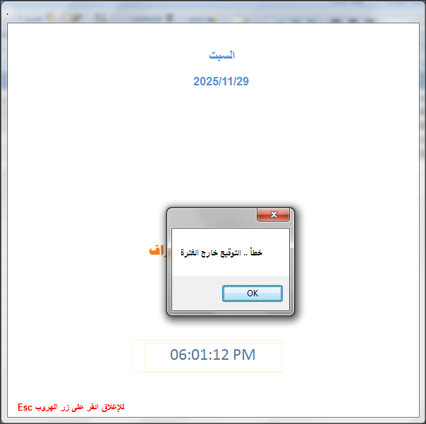 بعد التجربة السريعة لم ألحظ تغييرا إلا أن موظف الفترة المسائية أصبح غير مسموح له بالإنصراف كل توقيع تظهر التوقيع خارج الفترة حتى ولو بعد انصرافه بساعة ملحوظة : أحد الأجهز التى لم يكن يعمل عليها البرنامج باعتماد وقت الإنترنت قمنا بتنصيب ويندوز 7 64بت وعمل عليها البرنامج بشكل جيد -