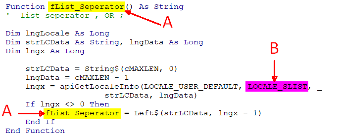 في المثال الذي ارفقته ، يمكنك الحصول على اي بيانات من الاعدادات الاقليمية ، فهناك بعض الامثلة على ذلك. هذا الكود كاملا من المرفق: Option Compare Database Option Explicit ' This code was originally written by Dev Ashish. ' It is not to be altered or distributed, ' except as part of an application. ' You are free to use it in any application, ' provided the copyright notice is left unchanged. ' ' Code Courtesy of ' Dev Ashish ' Public Const LOCALE_ILANGUAGE = &H1 ' language id Public Const LOCALE_SLANGUAGE = &H2 ' localized name of language Public Const LOCALE_SENGLANGUAGE = &H1001 ' English name of language Public Const LOCALE_SABBREVLANGNAME = &H3 ' abbreviated language name Public Const LOCALE_SNATIVELANGNAME = &H4 ' native name of language Public Const LOCALE_ICOUNTRY = &H5 ' country code Public Const LOCALE_SCOUNTRY = &H6 ' localized name of country Public Const LOCALE_SENGCOUNTRY = &H1002 ' English name of country Public Const LOCALE_SABBREVCTRYNAME = &H7 ' abbreviated country name Public Const LOCALE_SNATIVECTRYNAME = &H8 ' native name of country Public Const LOCALE_IDEFAULTLANGUAGE = &H9 ' default language id Public Const LOCALE_IDEFAULTCOUNTRY = &HA ' default country code Public Const LOCALE_IDEFAULTCODEPAGE = &HB ' default code page Public Const LOCALE_SLIST = &HC ' list item separator Public Const LOCALE_IMEASURE = &HD ' 0 = metric, 1 = US Public Const LOCALE_SDECIMAL = &HE ' decimal separator Public Const LOCALE_STHOUSAND = &HF ' thousand separator Public Const LOCALE_SGROUPING = &H10 ' digit grouping Public Const LOCALE_IDIGITS = &H11 ' number of fractional digits Public Const LOCALE_ILZERO = &H12 ' leading zeros for decimal Public Const LOCALE_SNATIVEDIGITS = &H13 ' native ascii 0-9 Public Const LOCALE_SCURRENCY = &H14 ' local monetary symbol Public Const LOCALE_SINTLSYMBOL = &H15 ' intl monetary symbol Public Const LOCALE_SMONDECIMALSEP = &H16 ' monetary decimal separator Public Const LOCALE_SMONTHOUSANDSEP = &H17 ' monetary thousand separator Public Const LOCALE_SMONGROUPING = &H18 ' monetary grouping Public Const LOCALE_ICURRDIGITS = &H19 ' # local monetary digits Public Const LOCALE_IINTLCURRDIGITS = &H1A ' # intl monetary digits Public Const LOCALE_ICURRENCY = &H1B ' positive currency mode Public Const LOCALE_INEGCURR = &H1C ' negative currency mode Public Const LOCALE_SDATE = &H1D ' date separator Public Const LOCALE_STIME = &H1E ' time separator Public Const LOCALE_SSHORTDATE = &H1F ' short date format string Public Const LOCALE_SLONGDATE = &H20 ' long date format string Public Const LOCALE_STIMEFORMAT = &H1003 ' time format string Public Const LOCALE_IDATE = &H21 ' short date format ordering Public Const LOCALE_ILDATE = &H22 ' long date format ordering Public Const LOCALE_ITIME = &H23 ' time format specifier Public Const LOCALE_ICENTURY = &H24 ' century format specifier Public Const LOCALE_ITLZERO = &H25 ' leading zeros in time field Public Const LOCALE_IDAYLZERO = &H26 ' leading zeros in day field Public Const LOCALE_IMONLZERO = &H27 ' leading zeros in month field Public Const LOCALE_S1159 = &H28 ' AM designator Public Const LOCALE_S2359 = &H29 ' PM designator Public Const LOCALE_SDAYNAME1 = &H2A ' long name for Monday Public Const LOCALE_SDAYNAME2 = &H2B ' long name for Tuesday Public Const LOCALE_SDAYNAME3 = &H2C ' long name for Wednesday Public Const LOCALE_SDAYNAME4 = &H2D ' long name for Thursday Public Const LOCALE_SDAYNAME5 = &H2E ' long name for Friday Public Const LOCALE_SDAYNAME6 = &H2F ' long name for Saturday Public Const LOCALE_SDAYNAME7 = &H30 ' long name for Sunday Public Const LOCALE_SABBREVDAYNAME1 = &H31 ' abbreviated name for Monday Public Const LOCALE_SABBREVDAYNAME2 = &H32 ' abbreviated name for Tuesday Public Const LOCALE_SABBREVDAYNAME3 = &H33 ' abbreviated name for Wednesday Public Const LOCALE_SABBREVDAYNAME4 = &H34 ' abbreviated name for Thursday Public Const LOCALE_SABBREVDAYNAME5 = &H35 ' abbreviated name for Friday Public Const LOCALE_SABBREVDAYNAME6 = &H36 ' abbreviated name for Saturday Public Const LOCALE_SABBREVDAYNAME7 = &H37 ' abbreviated name for Sunday Public Const LOCALE_SMONTHNAME1 = &H38 ' long name for January Public Const LOCALE_SMONTHNAME2 = &H39 ' long name for February Public Const LOCALE_SMONTHNAME3 = &H3A ' long name for March Public Const LOCALE_SMONTHNAME4 = &H3B ' long name for April Public Const LOCALE_SMONTHNAME5 = &H3C ' long name for May Public Const LOCALE_SMONTHNAME6 = &H3D ' long name for June Public Const LOCALE_SMONTHNAME7 = &H3E ' long name for July Public Const LOCALE_SMONTHNAME8 = &H3F ' long name for August Public Const LOCALE_SMONTHNAME9 = &H40 ' long name for September Public Const LOCALE_SMONTHNAME10 = &H41 ' long name for October Public Const LOCALE_SMONTHNAME11 = &H42 ' long name for November Public Const LOCALE_SMONTHNAME12 = &H43 ' long name for December Public Const LOCALE_SABBREVMONTHNAME1 = &H44 ' abbreviated name for January Public Const LOCALE_SABBREVMONTHNAME2 = &H45 ' abbreviated name for February Public Const LOCALE_SABBREVMONTHNAME3 = &H46 ' abbreviated name for March Public Const LOCALE_SABBREVMONTHNAME4 = &H47 ' abbreviated name for April Public Const LOCALE_SABBREVMONTHNAME5 = &H48 ' abbreviated name for May Public Const LOCALE_SABBREVMONTHNAME6 = &H49 ' abbreviated name for June Public Const LOCALE_SABBREVMONTHNAME7 = &H4A ' abbreviated name for July Public Const LOCALE_SABBREVMONTHNAME8 = &H4B ' abbreviated name for August Public Const LOCALE_SABBREVMONTHNAME9 = &H4C ' abbreviated name for September Public Const LOCALE_SABBREVMONTHNAME10 = &H4D ' abbreviated name for October Public Const LOCALE_SABBREVMONTHNAME11 = &H4E ' abbreviated name for November Public Const LOCALE_SABBREVMONTHNAME12 = &H4F ' abbreviated name for December Public Const LOCALE_SABBREVMONTHNAME13 = &H100F Public Const LOCALE_SYSTEM_DEFAULT& = &H800 Public Const LOCALE_USER_DEFAULT& = &H400 Const cMAXLEN = 255 Pri