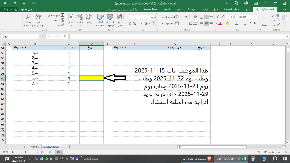 شكرا لك من القلب حفظك الله هل يوجد طريقة لادراج جميع التواريخ بحيث تكون مكرره فقط المتغير التاريخ اسم 6 تغيب 4 مرات هل استطيع تكرار الاسم مع تغير التاريخ وكذلك التغطيات وايضاً الاجازات -