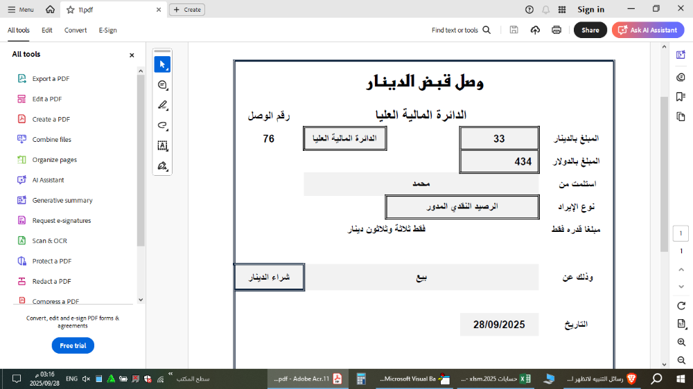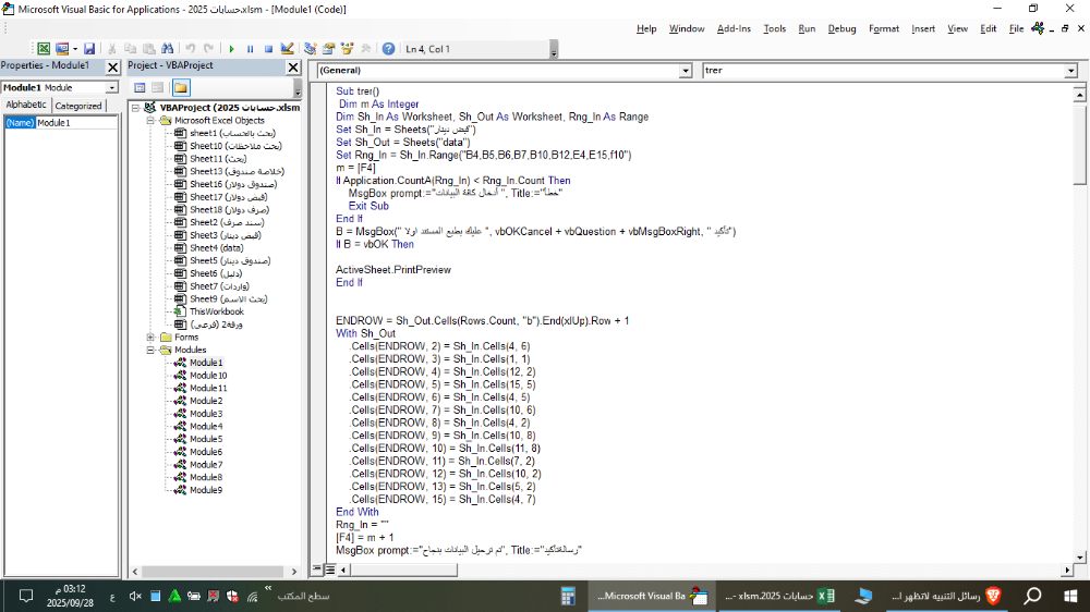 8. الاساتذة / hegazee - العبيدي رعد السلام عليكم ورحمة الله وبركاته قمت بتجربة الملف المرفق بدون اي تعديل مني بالنسبة لاسماء الصفخات او الكتابة العربية بالاكواد كلها سليمة بالنسبة لكود الترحيل يعمل بكفاءة وبسرعة وفام بطباعة الايصال والترحيل الى شيت DATA كود الترحيل ولغة الملف 100% تعلمنا من معلمنا عبدالله بافشير جزاه الله كل خير وخفظ يمننا السعيد من كل شر ومكروه انه عند نسخ كود ولصقه في مخرر الاكواد انه اذا كان في الكود حروف او كتابة عربية يجب تغيير لغة الكيبورد الى العربية وعندها انسخ والصق وستجد الكود بالحروف العربية اما اذا كانت لغة الكيبورد الانجليزية فالكتابة العربية ستظهر بلغة غير معروفة وهذا عن تجربة لكما ولكل اعضاء المنتدى كل التقدير والاحترام