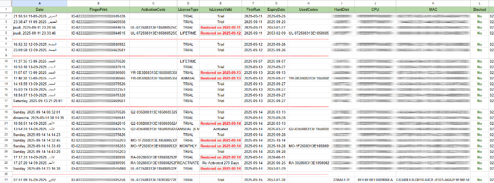 تم استخدام جوجل شيت كسيرفر يتم فيه تسجيل جميع الحركات والتفعيلات والاستيراد حسب رقم معرف جهاز العميل ، والتالي صورة توضيحية سابقة :- استخدم النسخة التي في هذه المشاركة هنا . بحيث احذف النسخة السابقة ( الأولى ) وقم بتشغيل ملف حذف ملفات التفعيل السابقة أولاً ، ثم قم بتشغيل النسخة الجديدة بعد تنقيحها من جميع الأخطاء السابقة الإحترازية ( بناءً على ردود الأخوة المشاركين ) . وهذه صورة لطريقة التفعيل عند المطور :-1 point