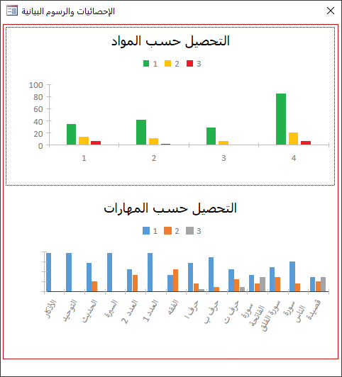 وعليكم السلام ورحمة الله وبركاته ,, إذا سمح لي بالمشاركة الأولى 🤗 ، خطر ببالي انشاء استعلامين بدايةً ، حيث :- الاستعلام الأول ( qry_Tahseel_By_Mada ) خصصته لعرض التحصيل حسب المواد ( عدد المهارات لكل درجة داخل كل مادة ) . وهدفي منه تحليل توزيع درجات المهارات داخل كل مادة . SELECT mada_id, AA, COUNT(AA) AS عدد_المهارات FROM tbl_Mharat_tqyeem GROUP BY mada_id, AA; أما الاستعلام الثاني ( qry_Tahseel_By_Mharah ) ، تم تخصيصه لعرض التحصيل حسب المهارات ( عدد الطلاب لكل درجة في كل مهارة ) . والهدف منه تحليل أداء الطلاب في كل مهارة على حدة . SELECT tbl_Mharat_tqyeem.Mhr_id, tbl_Mharat_tqyeem.Mharh_Nm, tbl_Mharat_tqyeem.AA, Count(tbl_Mharat_tqyeem.AA) AS عدد_الطلاب FROM tbl_Mharat_tqyeem GROUP BY tbl_Mharat_tqyeem.Mhr_id, tbl_Mharat_tqyeem.Mharh_Nm, tbl_Mharat_tqyeem.AA; وبناءً على هذين الإستعلامين ، قمت بإنشاء المخطط البياني لينتج لدي الشكل التالي :- والمرفق بهذه الفكرة :- Database2.zip1 point