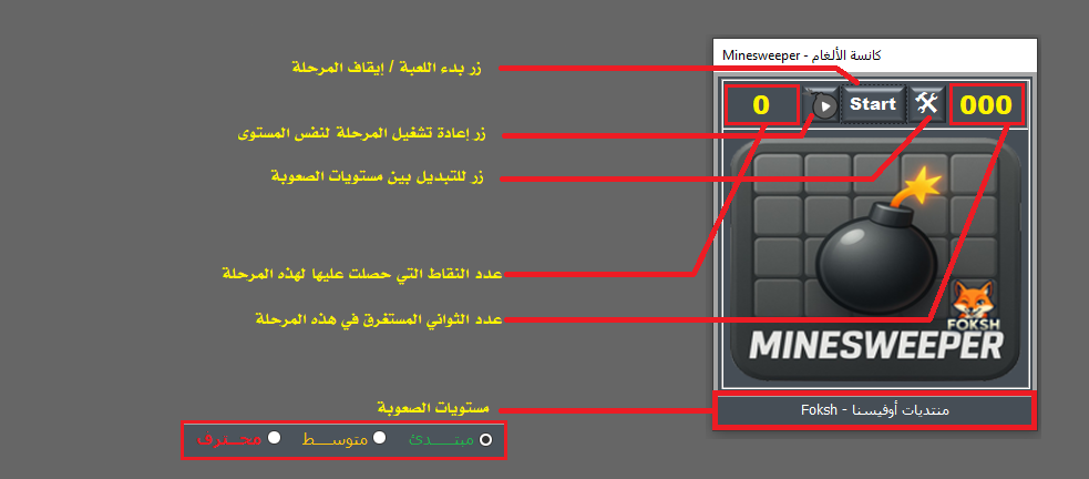 💣 التحديث الجديد الآن بإضافة التحكم بمستوى الصعوبة داخل اللعبة . حيث تبدأ اللعبة الآن بالمستوى المبتدئ ( العادي ) ، ويمكن لللاعب التنقل بين المستويات بشكل غير مقيد بإعادة اللعبة . يعني لو كنت في المستوى المبتدئ والمرحلة رقم 7 ، وأردت تجربة المستوى المتوسط لنفس المرحلة ، فإن ذلك متاح لك الآن بسهولة . 💣 توفير زر لإعادة تشغيل اللعبة للمستوى الحالي للبدء من المرحلة الأولى . 💣 تفاعل مرئي مع الرسائل عند انفجار لغم بعبارات متنوعة تظهر في أسفل شريط اللعبة . 💣 صورة لشرح بسيط لواجهة اللعبة :- 💣 تحميل اللعبة للنواتين :- 64 :- Minesweeper v 2.0 64.zip 32 :- Minesweeper v 2.0 32.zip2 points