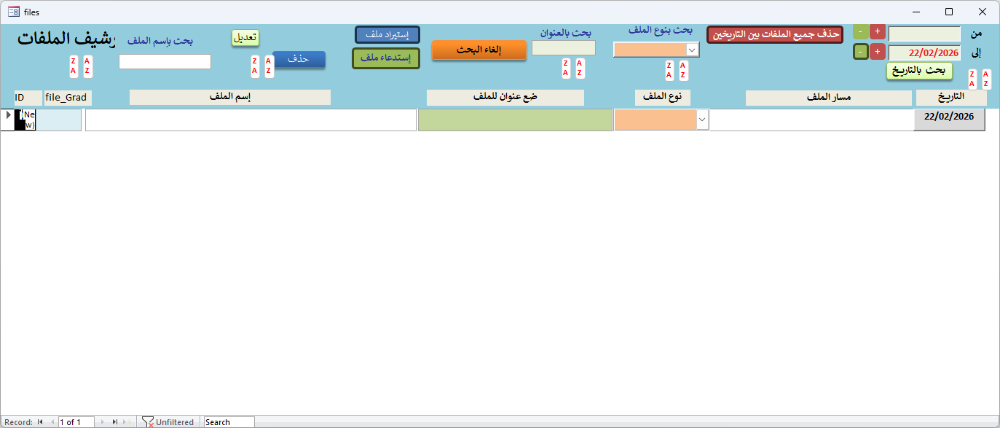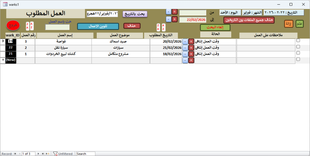 برنامج مكتبي لتنظيم الملفات التي علي جهازك و إدارة اعمالك وتذكريرك بوقت العمل وهو مقتبس من عدة افكار واريد ان اساهم في هذا الموقع الذي له فضل عليه بعد الله في تعليمي وإتقاني لقواعد البيانات وايضا استعنت بالله ثم بالذكاء الصناعي لعمل هذا المشروع وهذا كنوع من رد الجميل لهذا الموقع الذي له فضل عليه بعد الله واملي ان يعجبكم مشروع تنظيم الاعمال والملفات.accdb3 points