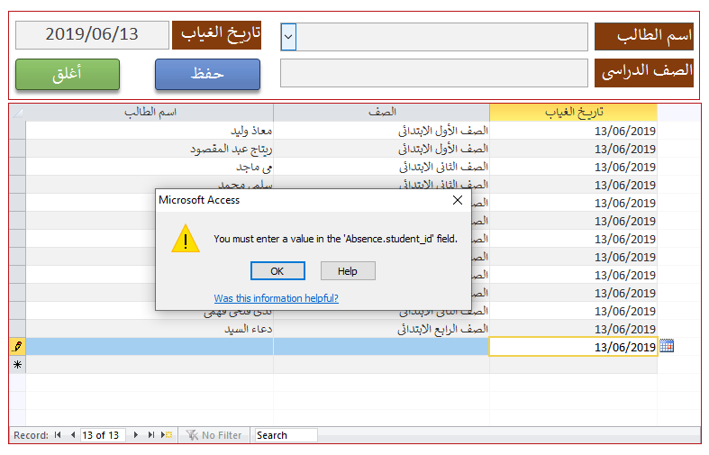 ابا جودى ربنا يكون في عونك انا عارف انك مشغول جدا بس ما تنسناش انك تشرح الكود وفي ملحوظة اخرى على البرنامج بافتراض اانا قفلت البرنامج واعدت تشغيلة وحابيت اضيف اسم بنفس التاريخ بالخطأ البرنامج يعطي رسالة خطأ كما في الصورة عند اضافة اسم دعاء السيد لنفس التاريخ 13/6/2019 ولا يغلق البرنامج بصورة طبيعية