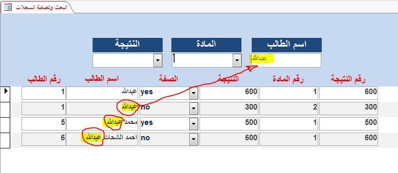 المفروض التطابق هيكون في احتمالين فقط اسم الكورس والدرجات كيف يكون تطابق عن طريق الاسم كمان ؟؟؟؟؟ هل يعقل ان يكون شخص اخد نفس الكورس اكثر من مرة وبنفس النتيجة على فكرة المرفق بيعمل كدا بيجيب اسماء الطلاب المشتركين لنفس الكورس وايضا لنفس الدرجات والصورة خير دليل على ذلك FilterResultFinal - Copy.accdb ملحوظة اخيرة حاول تضيف اسماء طلاب اخرين بنفس الاسماء المتشابهة ونفس الكورس والمواد هيديك النتيجة المرجوة -