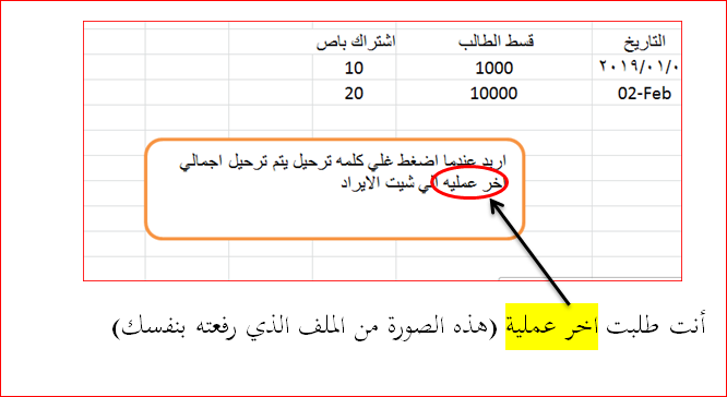 ربما ينفع هذا الكود Option Explicit Sub Dive_Last_Row() If ActiveSheet.Name = "الايراد" Then Exit Sub Sheets("الايراد").Range("a3").End(4).Offset(1).Resize(, 3).Value = _ ActiveSheet.Range("a4").End(4).Resize(, 3).Value End Sub الملف مرفق Matrek.xlsm