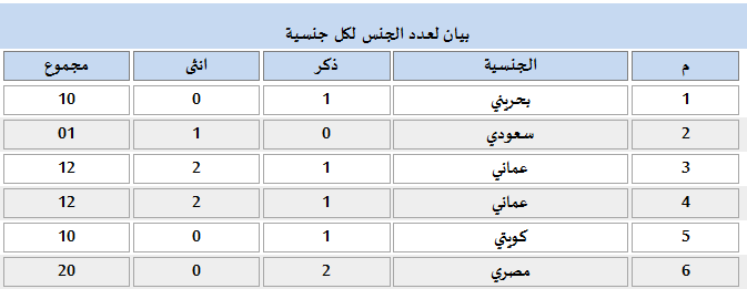 السلام عليكم ورحمة الله في قاعدة بياناتك ليس فيها معلومات كافية للعمل التقرير المطلوب اي ليس فيها حقل للبيان الجنسية -