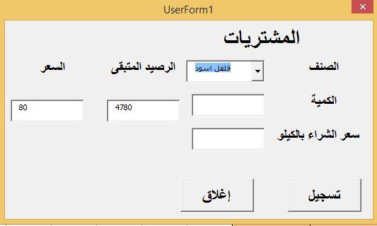 إخوانى الافاضل هذا هو المطلوب وسأشرحه بالصور هذه المرة لعلى لم أستطع أن اوضح فيما سبق كما هو موضح فى الصورة هذه صورة الفورم التى تظهر الصنف هو كومبوبوكس مربوط بأصناف المخزن الكمية : الكمية المشتراه بالجرام سعر الشراء بالكيلو : هو سعر الشراء الجديد للصنف السعر : هو سعر الصنف المسجل فى المخزن الرصيد المتبقى : هو رصيد الصنف المتبقى فى المخزن المطلوب أن أنفذ هذه الجملة ولكن فى شكل كود ماكرو أثناء الحفظ لو قيمة (سعر الشراء بالكيلو) = قيمة (السعر) احفظ , او اظهر الرسالة الاتية نص الرسالة "السعر الجديد يختلف عن السعر المسجل فى المخزن فهل تريد تسجيل السعر الجديد" وبعد ذلك تظهر رسالة بها 3 اختيارات أيا كان مسمى هذه الاختيارات المهم سيكون وظيفتهم كالتالى (سأقترح مسميات كمثال ولكنى لا اعرف هل هذا متاح فى msg box ولا لأ) موافق : يتم تسجيل السعر الجديد فى المخزن الغاء : يتم تجاهل السعر الجديد متوسط : بالضغط عليه يقوم الماكرو باحتساب متوسط سعر بين الجديد والمسجل فى المخزن (القديم) وتسجيله فى المخزن بدلا من القديم انا اعلم ان الفكرة قد تكون معقدة شيء ما فى الاكسل ولكنى استوحيتها من ملف اكسس كان يقوم بنفس الوظيفة مما جعلنى اطلب تنفيذها فى الاكسل وجزاكم الله خيرا مقدما -