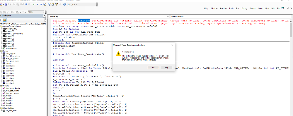السلام عليكم ما هو الخطأ في هذا الكود علما بان هذا الكود يشتغل على اوفس 2010 و عند نقل الملف على اوفس 2013 يظهر هذا الخطأ Private Declare Function SetWindowLong Lib "USER32" Alias "SetWindowLongA" (ByVal hWnd As Long, ByVal lngWinIdx As Long, ByVal dwNewLong As Long) As Long Private Declare Function FindWindow Lib "USER32" Alias "FindWindowA" (ByVal lpClassName As String, ByVal lpWindowName As String) As Long Dim hWnd As Long: Const GWL_STYLE = -16: Const WS_SYSMENU = &H80000 Dim AA As Integer Dim Tx_1() As New Ali_Pass_Num Private Sub CommandButton5_Click() UserForm2.Show End Sub Private Sub CommandButton6_Click() UserForm5.Show End Sub Private Sub UserForm_Deactivate() End Sub Private Sub UserForm_Initialize() Dim t As Integer, hWnd As Long, lStyle As Long: hWnd = FindWindow("ThunderDFrame", Me.Caption): SetWindowLong hWnd, GWL_STYLE, (lStyle And Not WS_SYSMENU) Dim A_TCoun As Integer, Ct A_TCoun = 0 For Each Ct In Array("TextBox1", "TextBox4") A_TCoun = A_TCoun + 1 ReDim Preserve Tx_1(1 To A_TCoun) Set Tx_1(A_TCoun).A_Tx_1 = Me.Controls(Ct) Next Ct t = 4 Do ComboBox1.AddItem Sheets("MyDate").Cells(t, 1) t = t + 1 Loop Until Sheets("MyDate").Cells(t, 1) = "" Me.Label1.Caption = Sheets("MyDate").Cells(3, 1) Me.Label2.Caption = Sheets("MyDate").Cells(3, 2) Me.Label3.Caption = Sheets("MyDate").Cells(3, 1) Me.Label4.Caption = Sheets("MyDate").Cells(3, 2) End Sub Private Sub ComboBox1_Change() TextBox1 = "" B_A False, False For i = 4 To Sheets("MyDate").Range("A1000").End(xlUp).Row If ComboBox1 = Sheets("MyDate").Cells(i, 1) Then TextBox2 = Sheets("MyDate").Cells(i, 1).Offset(0, 3) Exit For End If Next If TextBox2 = "مشاهدة وتعديل" Then B_A True, False End Sub Private Sub B_A(ByVal V_a As Boolean, ByVal E As Boolean) If ComboBox1 = "الدعم الفني" Then CommandButton5.Visible = V_a: CommandButton5.Enabled = E: CommandButton6.Visible = V_a CommandButton6.Enabled = E: CommandButton4.Visible = V_a: CommandButton4.Enabled = E Else CommandButton5.Visible = 0: CommandButton5.Enabled = 0 CommandButton4.Visible = 0: CommandButton4.Enabled = 0 CommandButton6.Visible = 0: CommandButton6.Enabled = 0 End If CommandButton3.Visible = V_a TextBox3.Visible = V_a TextBox4.Visible = V_a TextBox3.Enabled = E TextBox4.Enabled = E Label3.Visible = V_a Label4.Visible = V_a CommandButton3.Enabled = E End Sub Private Sub CommandButton1_Click() Dim i As Integer, MyRow As Integer, ii As Integer, Abu_Ahmed As Boolean Dim Sh_A As Worksheet On Error Resume Next Application.ScreenUpdating = False For i = 4 To Sheets("MyDate").Range("A1000").End(xlUp).Row If ComboBox1 = Sheets("MyDate").Cells(i, 1) And Val(TextBox1) = Sheets("MyDate").Cells(i, 2) Then MyRow = Sheets("MyDate").Cells(i, 2).Row Abu_Ahmed = True GoTo 1 Exit For End If Next ' ======== 1: If Abu_Ahmed = True Then Application.Visible = True Sheets("Mydate").DisplayHeadings = False Sheets("My Account").Cells(19, 5) = ComboBox1 & " " & Format(Now(), "yyyy/mm/dd hh:mm") Sheets("MyDate").Cells(Sheets("MyDate").[C50000].End(xlUp).Row + 1, 3) = ComboBox1 & " " & Format(Now(), "yyyy/mm/dd hh:mm") For ii = 5 To Sheets("MyDate").Range("IT3").End(xlToLeft).Column If Sheets("MyDate").Cells(MyRow, ii) = "مشاهدة وتعديل" Then Sheets(Sheets("MyDate").Cells(3, ii).Text).Visible = -1 End If If Sheets("MyDate").Cells(MyRow, ii) = "مشاهدة فقط" Then Sheets(Sheets("MyDate").Cells(3, ii).Text).Visible = -1 Sheets(Sheets("MyDate").Cells(3, ii).Text).Unprotect (Sheets("mydate").Range("b4")) Sheets(Sheets("MyDate").Cells(3, ii).Text).Cells.Locked = True Sheets(Sheets("MyDate").Cells(3, ii).Text).Protect (Sheets("mydate").Range("b4")) End If '------------------------------------------------------------------------------------- If Sheets("MyDate").Cells(MyRow, ii) = "مخفي" Then Sheets(Sheets("MyDate").Cells(3, ii).Text).Visible = xlSheetVeryHidden End If '----------------------------------------------------------------------------------- If Sheets("MyDate").Cells(MyRow, ii) = "مدخل بيانات" Then Sheets(Sheets("MyDate").Cells(3, ii).Text).Visible = -1 Sheets(Sheets("MyDate").Cells(3, ii).Text).Unprotect (Sheets("mydate").Range("b4")) Sheets(Sheets("MyDate").Cells(3, ii).Text).Cells.Locked = True For i = 1 To Sheets(Sheets("MyDate").Cells(3, ii).Text).Cells(1, Columns.Count).End(xlToLeft).Column If Sheets(Sheets("MyDate").Cells(3, ii).Text).Cells(1, i).Value = "T" Then Sheets(Sheets("MyDate").Cells(3, ii).Text).Cells(1, i).EntireColumn.Locked = False End If Next Sheets(Sheets("MyDate").Cells(3, ii).Text).Protect (Sheets("mydate").Range("b4")) End If '------------------------------------------------------------------------------------ Next MsgBox "تفضل بالدخول", vbOKOnly, "تنبيه" Me.Hide With Sheets("My Account") .Activate .[IV1] = "" .[IV1] = Me.ComboBox1 '---------------------------------------------------------------------------- .[IU1] = Sheets("mydate").Range("b4") 'لتخزين كلمه سر الادمن فى هذة الخليه '---------------------------------------------------------------------------- End With Else MsgBox IIf(AA >= 2, "خروج", "دخول خاطئ حاول مرة أخرى "), vbOKOnly + 524288 + 1048576, "تنبيه" ComboBox1 = "": TextBox1 = "" AA = AA + 1 If AA > 2 Then Unload Me Exit Sub End If ActiveWorkbook.Protect (Sheets("mydate").Range("b4")) 'لحمايه المستند بنفس كلمه سر الادمن Application.ScreenUpdating = True End Sub Private Sub CommandButton2_Click() Unload Me End Sub Private Sub CommandButton3_Click() If TextBox3 = "" Or TextBox4 = "" Then MsgBox "الرجاء إكمال الحقول الناقصة", vbOKOnly, "تنبيه": TextBox3.SetFocus: Exit Sub lr = Sheets("MyDate").Range("A1000").End(xlUp).Row Sheets("MyDate").Cells(lr + 1, 1) = TextBox3 Sheets("MyDate").Cells(lr + 1, 2) = Val(TextBox4) With UserForm2 .CommandButton3.Caption = "حفظ جديد" .Label2.Visible
