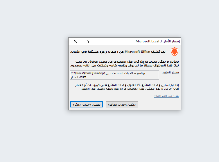 السلام عليكم لدي برنامج صلاحيات دخول مستخدمين نقلته عبر الايميل الى كمبيوتر اخر ولكنه لم يشتغل هل بالمكان معالجة الامر ؟ برنامج صلاحيات.xlsm