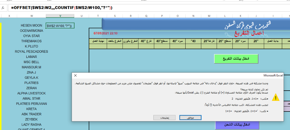 السادة مبدعي و عمالقة الاكسل السلام عليكم يوجد لذي ملف اكسل به مجموعة من الاوراق الورقة التي تحمل اسم (الشاشة الرئيسية ) ارغب بإنشاء بها جزء البحث يتكون من ثلاث اجزاء 1/ تقرير عام بين تاريخين و تكون النتائج في ورقة المحصلة 2/ تقرير عن شحنة يتم تحديدها بين تاريخين 3/ تقرير عن سفينة محددة بتاريخ محدد (تاريخ الارساء) و لكم مني جزيل الشكر و فائق الاحترام سلافا خالد حرب - نسخة.xlsx