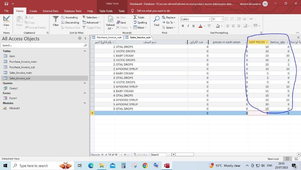 اخي الكريم الف شكر على مساعدتك كان في استفسار كما موضح في الصور فى فى جدول الوارد حقل العدد والبونس المفروض يتجمعوا مع بعض وفي جدول المنصرف المفروض يتجمع العدد مع البونس وفي الاستعلام في criteria ليه مختار اسم صنف معين؟ وفي الفورم اي لازمة تصفير المبيعات ؟ وبعد الضغط عليه قفلت الفورم وفتحته لكن مش عايز يجيب المبيعات مرة اخرى رغم انها موجودة فى جدول المبيعات وجزاكم الله خيرا على المساعدة Database4.accdb -
