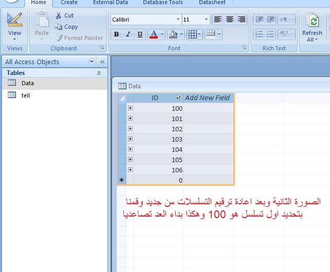 السلام عليكم شكرا على الاجابة ولكن هذا ليس طلبي . طلب هو انه لدي قاعدة بيانات وتحتوي على جدول Data لديه علاقات مرتبطه مع جدول اخر وفي هذا الجدول يوجد حقل ID فيه تسلسلات المطلوب هو اعادة ترقيم التسلسلات القديمة من رقم معين احدده انا فمثلا اريد اعادة التسلسلات القديمه ويبدا من رقم 100 ثم 101 ثم 102 وهكذا وكما بالصوره وشكرا