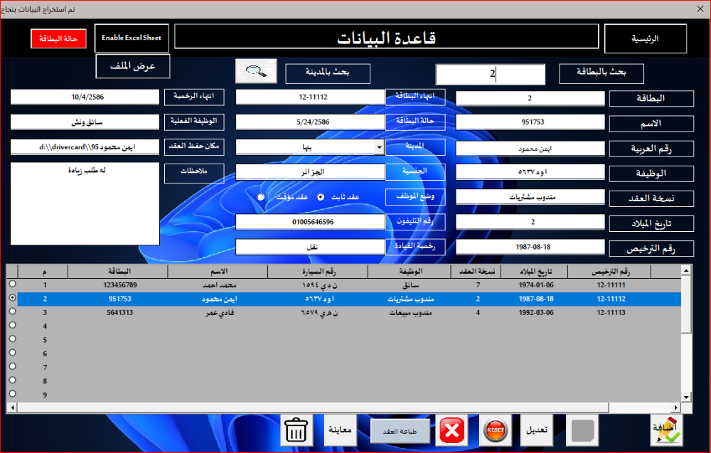 السلام عليكم ورحمه الله وبركاته ا. عبدالله بشير عبدالله شكرا لحضرتك بارك الله فيك البحث يعمل سواء بالرقم او بالمدينة المشكلة بالنسبة للاضافة بعد ما كتبت البيانات واضفت تم حفظ البيانات ولكن بيانات مختلفة كما بالصور ولا اعلم ما المشكلة عند الحفظ وكتابة البيانات وبالنسبة لنقطة طباعة العقد فهو معتمد على ليبل مكان حفظ العقد وبالفعل كانت خطوة اخرى بعد الانتهاء من تصحيح الاكواد ساقوم بارشفة العقود داخل فولدر وعرضها من خلال الاكسيل -