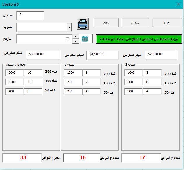 جرب هدا Sub DeleteRows() Dim WS As Worksheet, lastRow As Long, i As Long, OnRng As Range Dim choose As VbMsgBoxResult, DataRng As Range, Cnt As Boolean Set WS = Sheets("ورقة1") Set DataRng = WS.Range("A1:E50") lastRow = WS.Cells(WS.Rows.Count, "A").End(xlUp).Row Cnt = False For i = 3 To lastRow If WS.Cells(i, 3).Value <> "" And WS.Cells(i, 4).Value <> "" Then Cnt = True Exit For End If Next i If Not Cnt Then MsgBox "لا توجد بيانات مطابقة للحذف", vbExclamation, "خطأ" Exit Sub End If choose = MsgBox("هل أنت متأكد أنك تريد حذف من استلمو الاول والثاني ؟", vbYesNo + vbQuestion, "تأكيد الحذف") Application.ScreenUpdating = False If choose = vbYes Then For i = lastRow To 3 Step -1 If WS.Cells(i, 3).Value <> "" And WS.Cells(i, 4).Value <> "" Then If OnRng Is Nothing Then Set OnRng = WS.Rows(i) Else Set OnRng = Union(OnRng, WS.Rows(i)) End If Next i If Not OnRng Is Nothing Then OnRng.Delete For i = 3 To WS.Cells(WS.Rows.Count, "B").End(xlUp).Row WS.Cells(i, 1).Value = i - 2 Next i MsgBox "تم حذف الصفوف بنجاح", vbInformation, "الحذف" With WS .PageSetup.TopMargin = .PageSetup.BottomMargin = .PageSetup.LeftMargin = .PageSetup.RightMargin = Application.InchesToPoints(0.5) .[C1].Value = Format(Date - 1, "dd/mm/yyyy") .[B1].Value = Format(Date - 1, "dddd") End With With DataRng.Font .Name = "Arial": .Size = 16: .Bold = True: .Color = RGB(0, 0, 251) End With Else MsgBox "لا توجد صفوف مطابقة للحذف", vbExclamation, "لم يتم الحذف" End If Else MsgBox "تم إلغاء عملية الحذف", vbInformation, "إلغاء" End If Application.ScreenUpdating = True End Sub مثال1 v2.xlsm -
