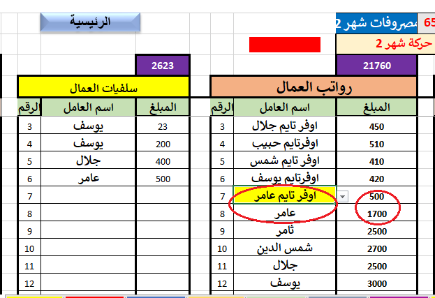 وعليكم السلام ورحمة الله وبركاته جميع المعادلات تختاج الى تعديل اريد ان استفسر يوجد في شيتات حركات الشهور المرتب والسلفيات لنأتى للمرتب تجد ان هناك اسماء وامامها المبلغ مثلا اسم عامر في خركة شهر 2 امامه مبلغ 1700 وفي نفس العمود يوجد اوفر تايم عامر 500 هل مرتب عامر 1700 ام 2200 اذا كان 2200 فالمعادلات تختاج الى تغيير بحيث تبحث عن الاسم في أي مكان ضمن النص وليس فقط التطابق التام وكذلك الامر ينطبق على السلفيات في انتظار ردك