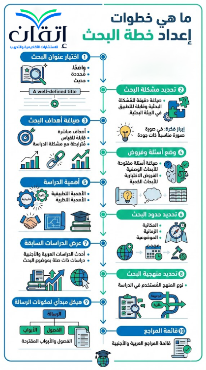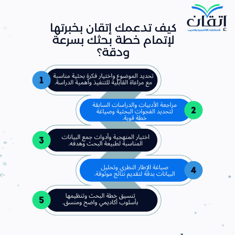 تقدّم شركة إتقان للاستشارات الأكاديمية والتدريب خدمات شاملة في خطة البحث الجامعي؛ مما يساعد الطلاب على تنظيم أفكارهم وتحويلها إلى خطة منهجية واضحة، كما نوفر شرحًا عمليًا حول كيفية كتابة خطة البحث بطريقة سهلة ومبسطة، كما نساعد في تطوير الإطار النظري واختيار أدوات جمع البيانات، هدفنا تمكين الطلاب من تقديم خطة بحث متكاملة وقابلة للاعتماد، مع إتقان تصبح رحلة البحث سهلة ومنظمة.