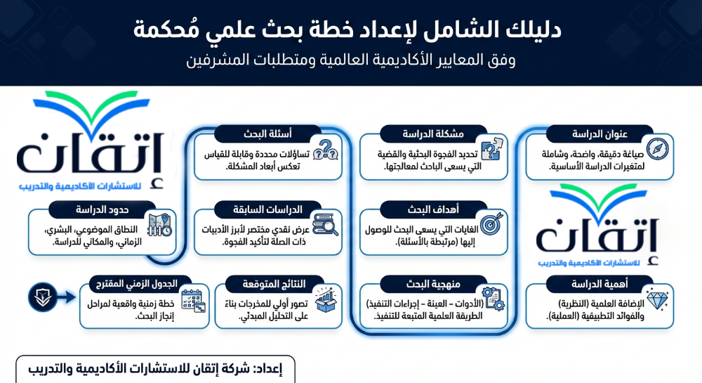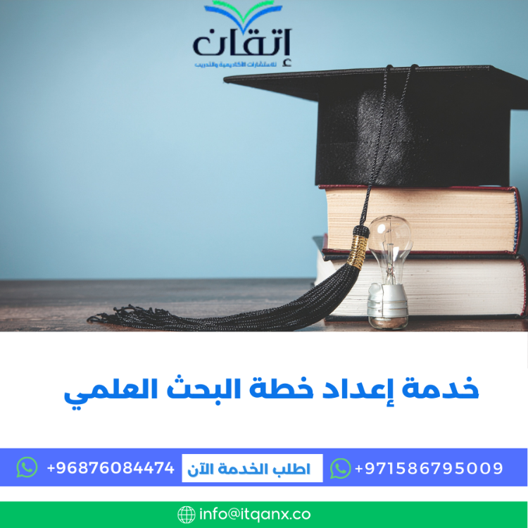 تقدم شركة إتقان للاستشارات الأكاديمية والتدريب خدمات متكاملة للباحثين في جميع المراحل الأكاديمية؛ حيث نتميز في إعداد خطة البحث العلمي بشكل احترافي ومنظم يراعي المعايير الجامعية، يعمل فريقنا على توضيح جميع خطوات البحث وتقديم التوجيه العلمي المناسب للطالب والباحث، كما نوفر الدعم الكامل في تطوير أفكار البحث وتحويلها إلى خطة منهجية واضحة، نساعد الباحث على فهم خطة البحث الجامعي ومتطلباتها، كل هذا يتم بأسلوب يسهل تطبيقه ويضمن قبول الخطط من أول مرة، هدفنا تمكين الباحث من تقديم خطة بحث متميزة وقابلة للاعتماد.