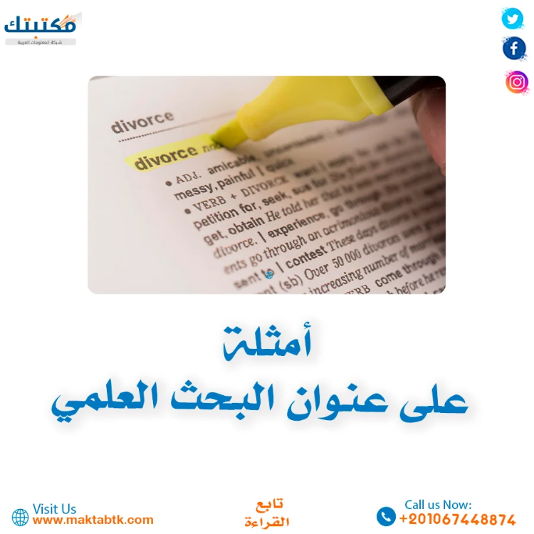 تُقدّم شركة مكتبتك – شبكة المعلومات العربية خدمة أكاديمية متخصصة في توفير أمثلة عن عنوان البحث العلمي مصاغة وفق الأسس المنهجية المعتمدة في الجامعات، نُساعد الباحثين على الاطّلاع على عناوين بحوث متنوعة، مع اقتراح عناوين بحوث علمية دقيقة ومبتكرة تناسب مختلف التخصصات والمراحل الجامعية، وتراعي وضوح المشكلة البحثية وقابليتها للدراسة، بما يُسهم في اختيار عنوان قوي يُمهّد لبحث علمي ناجح ومتميّز.
