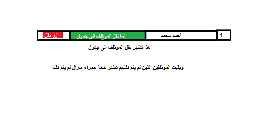 رابح1999 قام بنشر يوليو 1, 2020 قام بنشر يوليو 1, 2020 السلام عليكم اريد كود عند نقل بيانات موظف من جدول الى اخر تظهر خانة خضراء امام معلوماته تم نقل الموظف الى جدول اخر واليكم الشرح 22.bmp